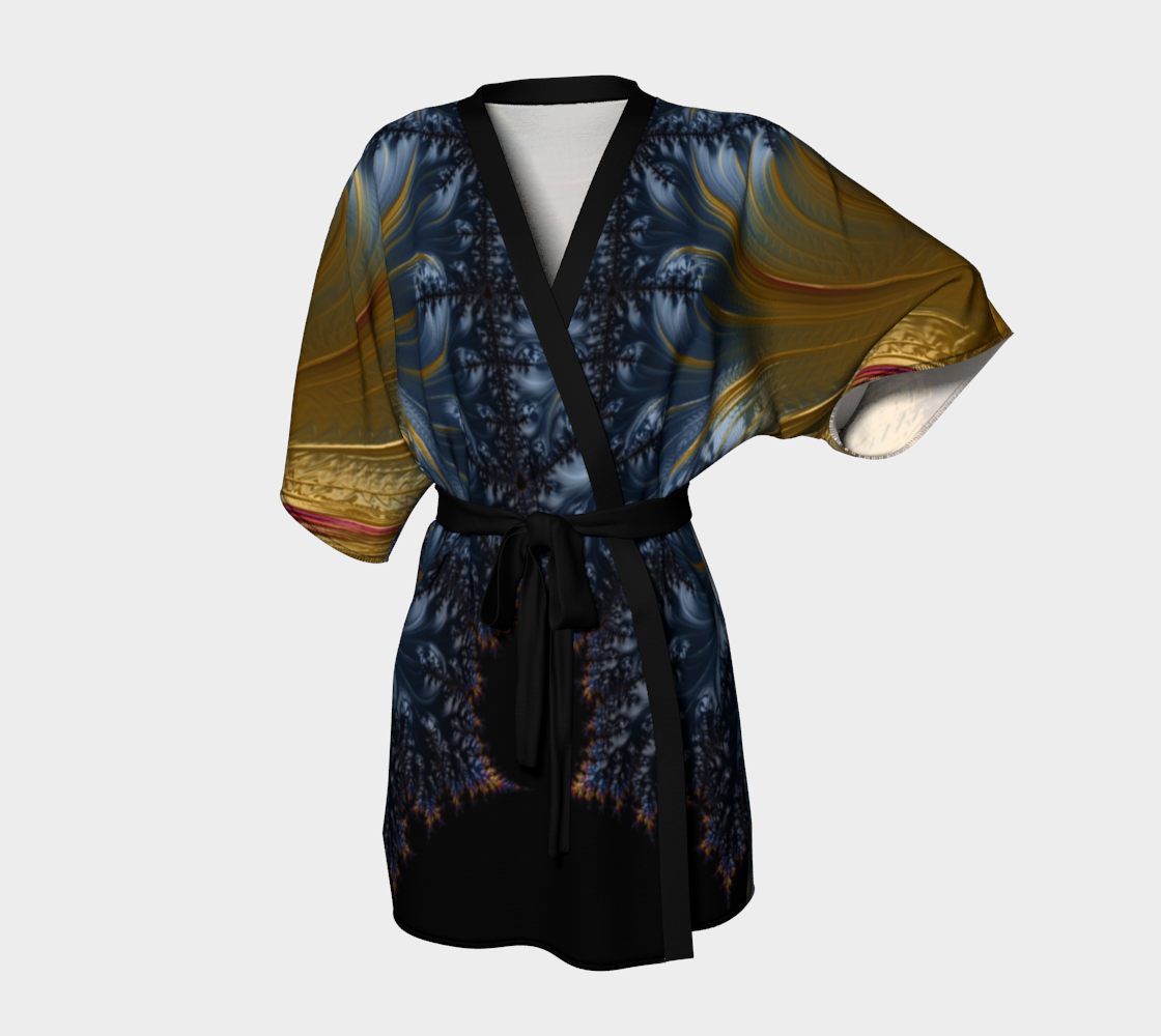 Artwork paired with luxury in this line of kimonos. Dramatic, elegant look. Perfect for special occasions, gallery shows and festivals! frACTal ACTions brand